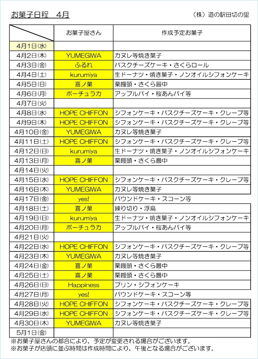 ~お菓子の里日程表~